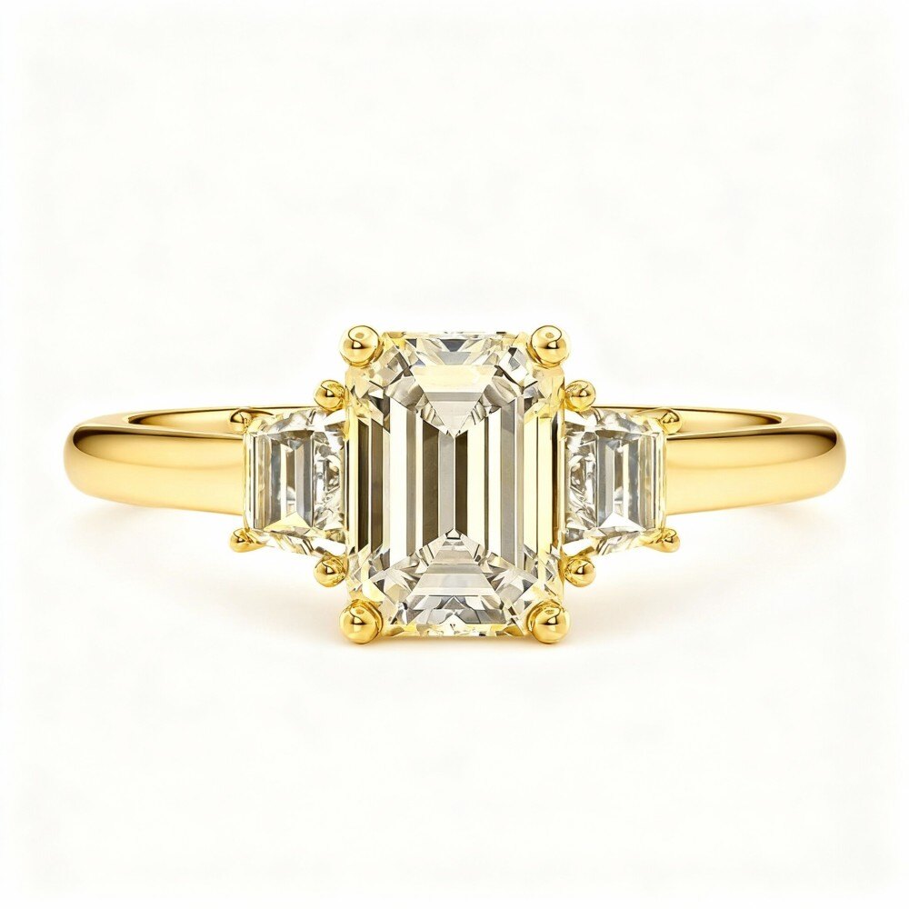 エレガンスと献身の完璧な融合を体現する、美しい10Kゴールド スリーストーン エンゲージリング。輝くモアッサナイトを贅沢なゴールドにセットしました。総重量2カラットのこの美しいリングは、変わらぬ愛と献身を象徴するようにデザインされており、大切な女性への忘れられない贈り物となるでしょう。
