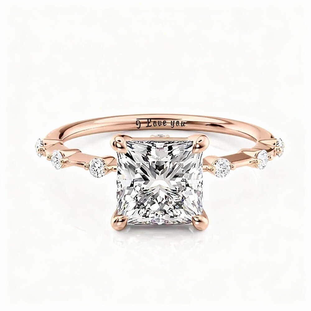 究極の愛の表現となる10Kローズゴールドのエンゲージリングは、女性のために熟練の職人によって丁寧に作られ、輝くモアッサナイトの宝石にパーソナライズされた刻印が施され、時代を超えて愛される感動的な一品です。