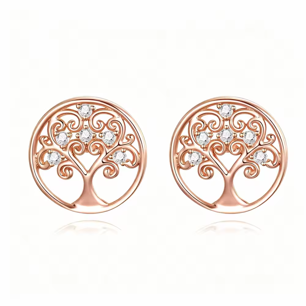 きらめくキュービックジルコニアをあしらった、エレガンスと意味深いデザインが融合した、魅力的な10Kローズゴールドのツリーオブライフスタッドピアスをご覧ください。