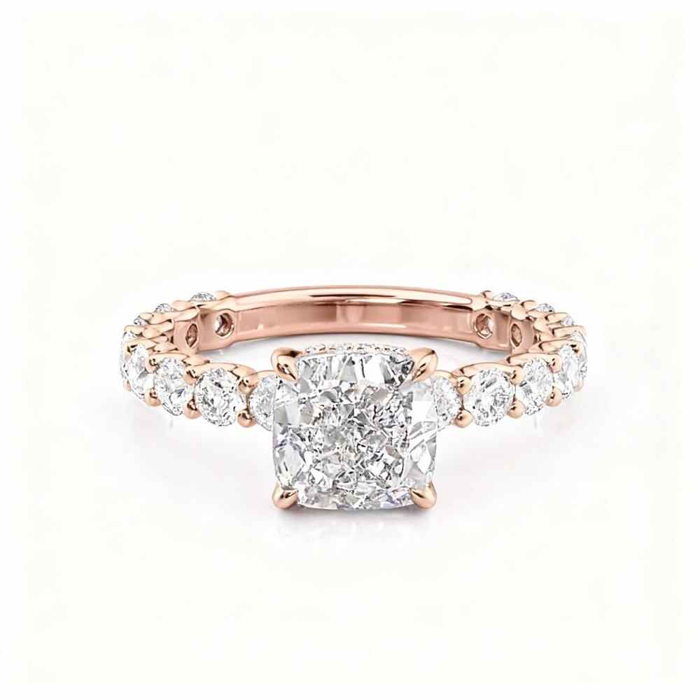 18Kローズゴールドを精巧に使い、鮮やかなモアッサナイトの宝石をセットした、贅沢なレディースエンゲージメントリングで永遠の愛を称えましょう。時代を超えたエレガンスと比類のない輝きを放ちます。