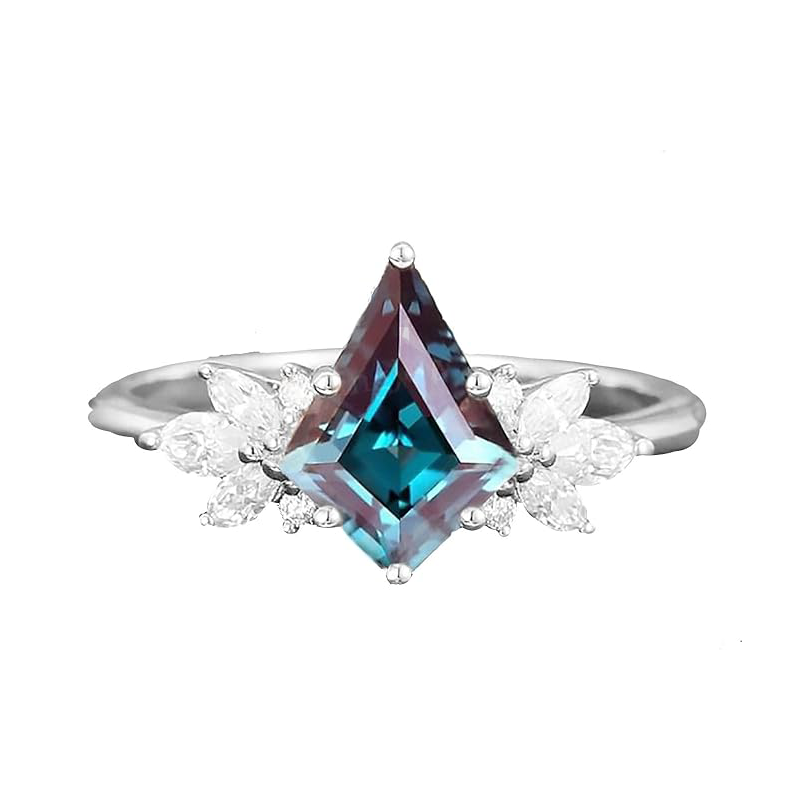 寸法:サイズは 4 から 13 まで。メインストーンはカイトシェイプのアレキサンドライトです。周囲には、クラリティI1、カラーDの小粒のホワイトラウンドカットモアッサナイトがあしらわれ、最高の輝きと耐久性を実現しています。